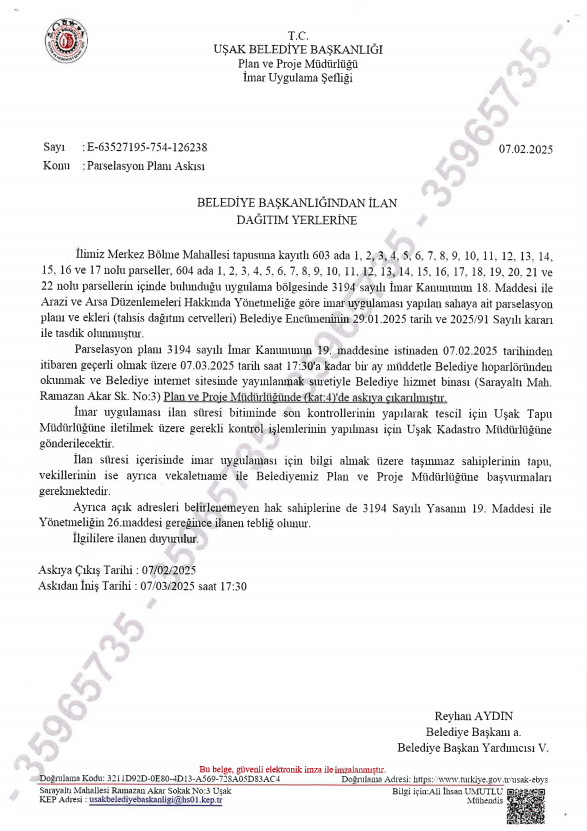 Bölme Mahallesi 603 ve 604 Adalar Muhtelif Parsellerde 3194 Sayılı İmar Kanununun 18. Madde Uygulama çalışması 2. kez askıya çıkarılmıştır. Uşak Belediyesi A blok 4. Kat Plan ve Proje Müdürlüğü İmar Uygulama Şefliğinden Bilgi Alabilirsiniz.