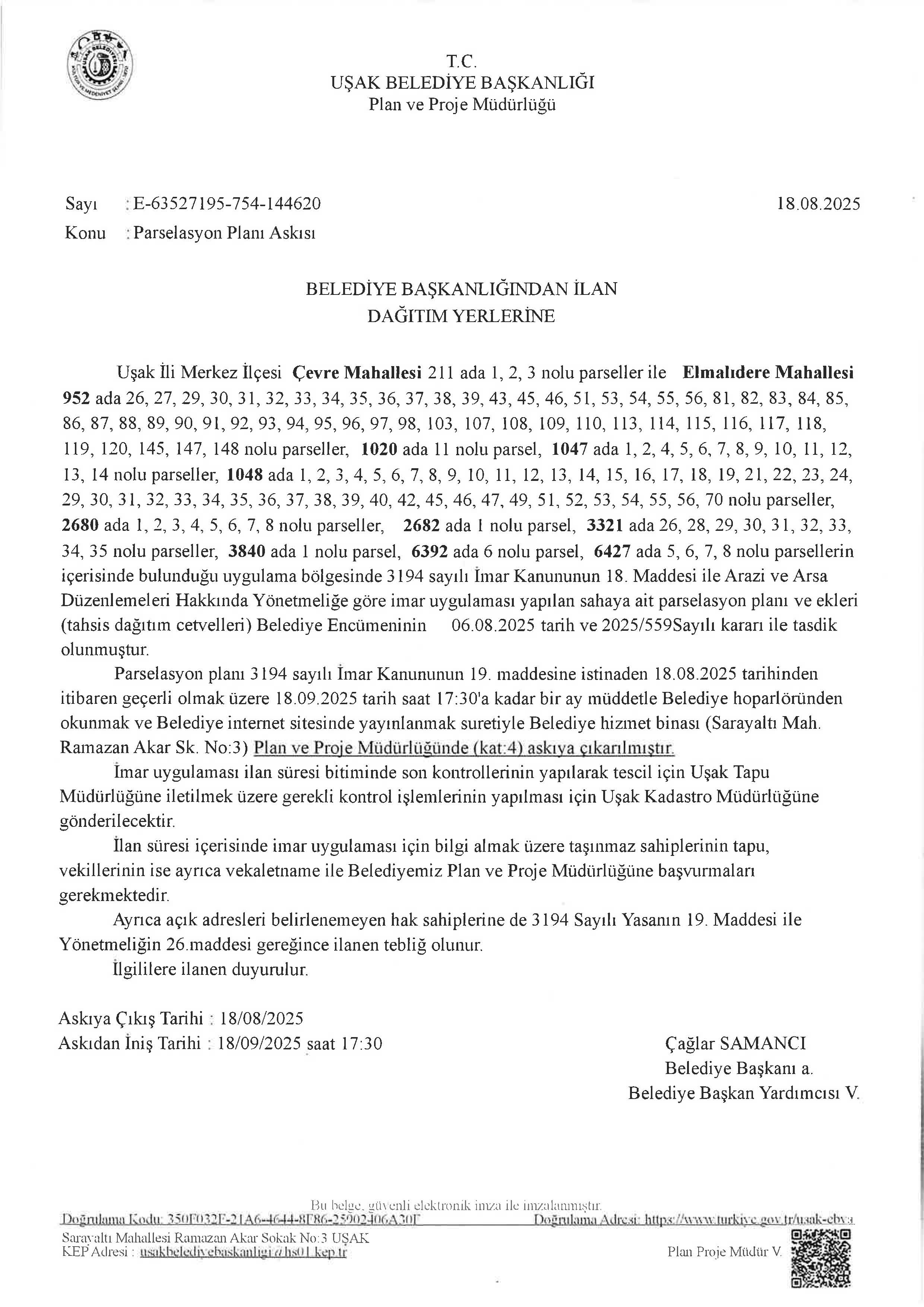Uşak İli Merkez İlçesi Çevre Mahallesi 211 ada 1, 2, 3 nolu parseller ile Elmalıdere Mahallesi 952ada26,2 29,30,31,32,33,34,35,36,37,38,39,43,45,4 51, 53, 54, 55, 56, 81, 82, 83, 84, 85, 86, 87, 88, 89, 90, 91, 92, 93,94, 95, 96, 97, 98, 103, 107, 108, 109, 110, 113, 114, 115, 116, 117, 118,119, 120, 145, 147, 148 nolu parseller, 1020 ada 11 nolu parsel, 1047 ada 1, 2, 4, 5, 6, 7, 8, 9, 10, 11, 12,13, 14 nolu parseller, 1048 ada 1, 2, 3, 4, 5, 6, 7, 8, 9, 10, 11, 12, 13, 14, 15, 16, 17, 18, 19, 21, 22, 23, 24, 29, 30, 31, 32, 33, 34, 35, 36, 37, 38, 39, 40, 42, 45, 46, 47, 49, 51, 52, 53, 54, 55, 56, 70 nolu parseller, 2680 ada 1, 2, 3, 4, 5, 6, 7, 8 nolu parseller, 2682 ada 1 nolu parsel, 3321 ada 26, 28, 29, 30, 31, 32, 33, 34, 35 nolu parseller, 3840 ada 1 nolu parsel, 6392 ada 6 nolu parsel, 6427 ada 5, 6, 7, 8 nolu parsellerin içerisinde bulunduğu uygulama bölgesinde 3194 sayılı İmar Kanununun 18. Maddesi ile Arazi ve Arsa Düzenlemeleri Hakkında Yönetmeliğe göre imar uygulaması yapılan sahaya ait parselasyon planı 18.08.2025 tarihinden itibaren geçerli olmak üzere 18.09.2025 tarih saat 17:30'a kadar bir ay müddetle Belediye hizmet binası (Sarayaltı Mah. Ramazan Akar Sk. No:3) Plan ve Proje Müdürlüğünde (kat:4)'de askıya çıkarılmıştır. Ayrıca Uşak İli Merkez İlçesi Çevre Mahallesi ve Elmalıdere Mahallesi muhtarlıklarında askıya çıkarılmıştır. İmar uygulaması ilan süresi bitiminde son kontrollerinin yapılarak tescil için Uşak Tapu Müdürlüğüne iletilmek üzere gerekli kontrol işlemlerinin yapılması için Uşak Kadastro Müdürlüğüne gönderilecektir. İlan süresi içerisinde imar uygulaması için bilgi almak üzere taşınmaz sahiplerinin tapu, vekillerinin ise ayrıca vekaletname ile Belediyemiz Plan ve Proje Müdürlüğüne başvurmaları gerekmektedir.