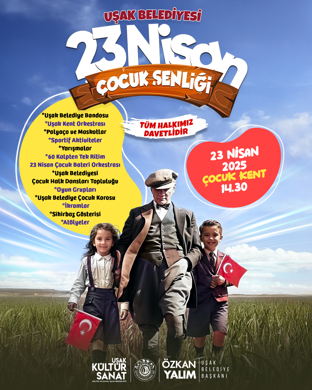 23 NİSAN COŞKUSU UŞAK’TA ÇOCUKLARLA BULUŞUYOR! ????Uşak Belediyesi olarak, 23 Nisan Ulusal Egemenlik ve Çocuk Bayramı’nı büyük bir şenlikle kutluyoruz!Tüm çocuklarımızı ve ailelerini bu muhteşem güne davet ediyoruz!Gelin, ...