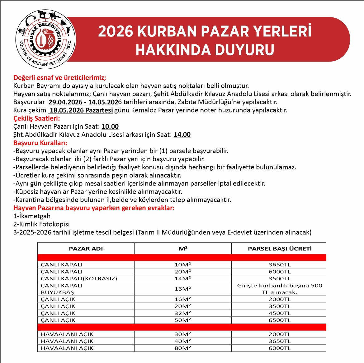 Uşak Belediyesi yaklaşan Kurban Bayramı öncesi vatandaşların kurbanlık hayvan alabileceği noktaları belirledi. Çanlı Hayvan Pazarı ve Şehit Abdülkadir Kılavuz Anadolu Lisesi arkası olmak üzere iki ayrı noktada kurulacak pazarlar için başvurular bugün başladı.