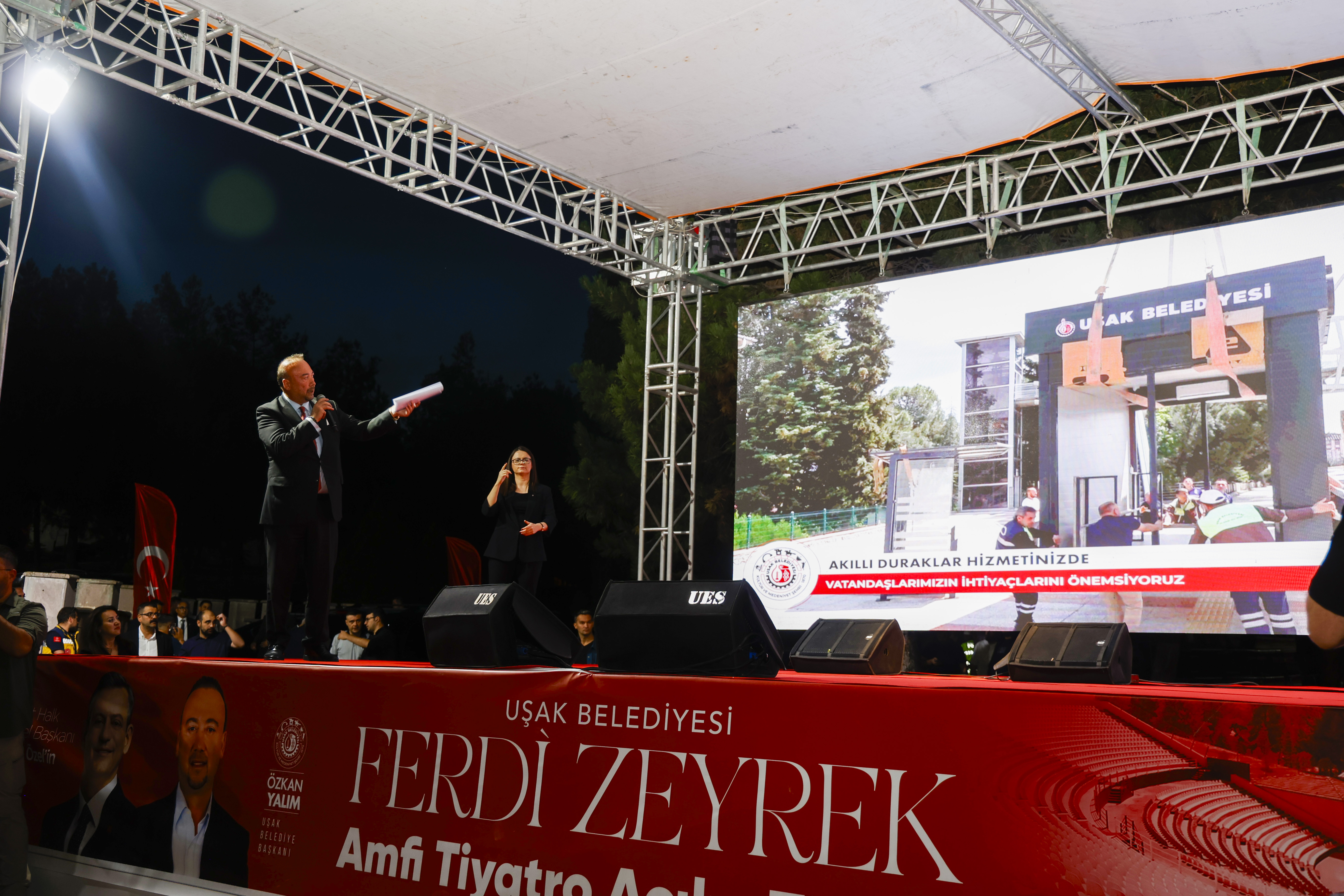 Açılış töreninde yaptığı konuşmada Huzurpark’ta bulunan amfi tiyatronun restorasyon ve çevre düzenleme çalışmalarını tamamladıklarını ve vatandaşların hizmetine gururla sunduklarını söyleyen Uşak Belediye Başkanı Özkan Yalım; Merhum Başkan Ferdi Zeyrek’in adını amfi salonuna vererek tüm Türkiye’nin sevgisini kazanmış bu değerli ismin her an yeniden anılmasına katkı sağladıklarını belirtti. Özellikle kentin kültürel etkinliklerini ve sosyal donatılarını artırarak halkı sanatsal aktivitelerle daha sık buluşturmak istediklerini belirten Başkan Yalım; kente kazandırdıkları projelerden konuşmasında bahsederek "Sayın Genel Başkanımızın, bizlere verdiği talimat doğrultusunda, 35 yıl sonra yeniden kazandığımız Uşak Belediyesini, geçtiğimiz 1,5 yıllık süreçte en iyi şekilde yönetmek için var gücümüzle çalışıyoruz. Karşılaştığımız tüm engellemelere rağmen, vatandaşlarımızın sorunlarını çözmek ve her projemizi hayata geçirmek adına mücadele ettik, etmeye de devam edeceğiz" dedi.