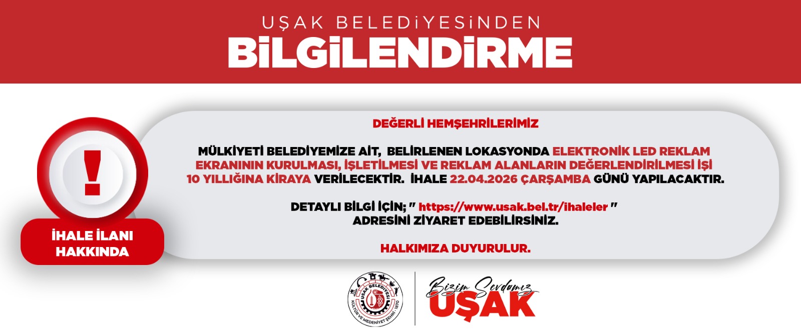 DETAYLI BİLGİ İÇİN; '' https://www.usak.bel.tr/ihaleler '' ADRESİNİ ZİYARET EDEBİLİRSİNİZ.