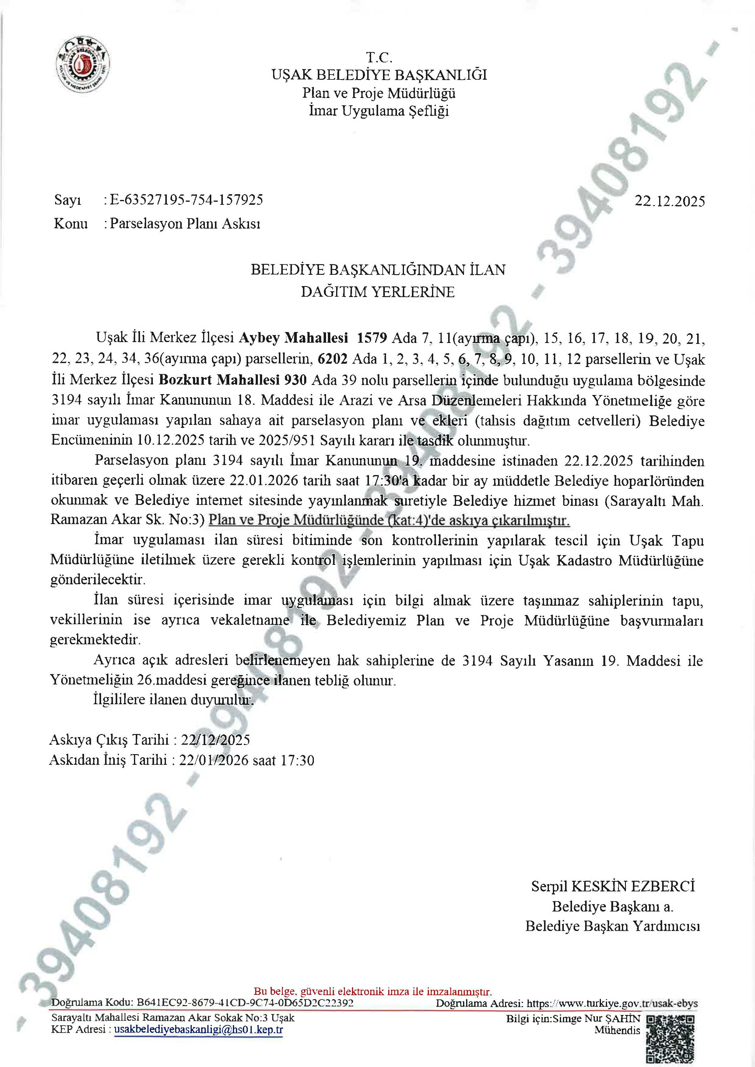 Parselasyon planı 3194 sayılı İmar Kanununun 19. maddesine istinaden 22.12.2025 tarihinden itibaren geçerli olmak üzere 22.01.2026 tarih saat 17:30'a kadar bir ay müddetle Belediye hoparlöründen okunmak ve Belediye internet sitesinde yayınlanmak suretiyle Belediye hizmet binası (Sarayaltı Mah. Ramazan Akar Sk. No:3) Plan ve Proje Müdürlüğünde (kat:4)'de askıya çıkarılmıştır.