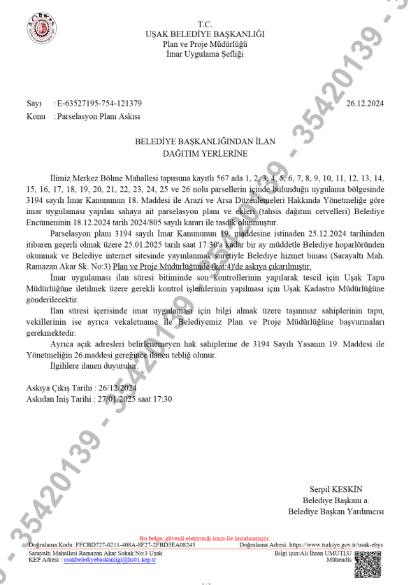Çevre Mahallesi ve Elmalıdere Mahallesi 49. Bölge 3194 Sayılı İmar Kanununun 18. Madde Uygulaması Parselasyon Askısı