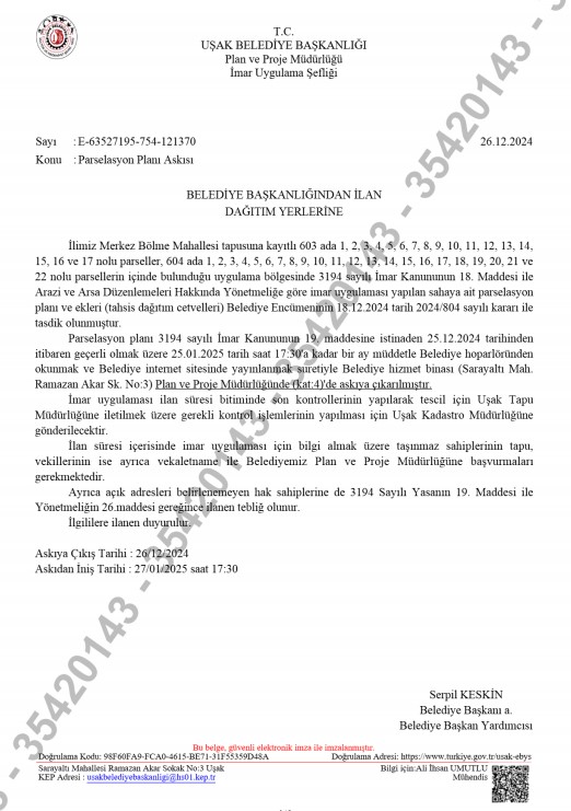 Çevre Mahallesi ve Elmalıdere Mahallesi 49. Bölge 3194 Sayılı İmar Kanununun 18. Madde Uygulaması Parselasyon Askısı