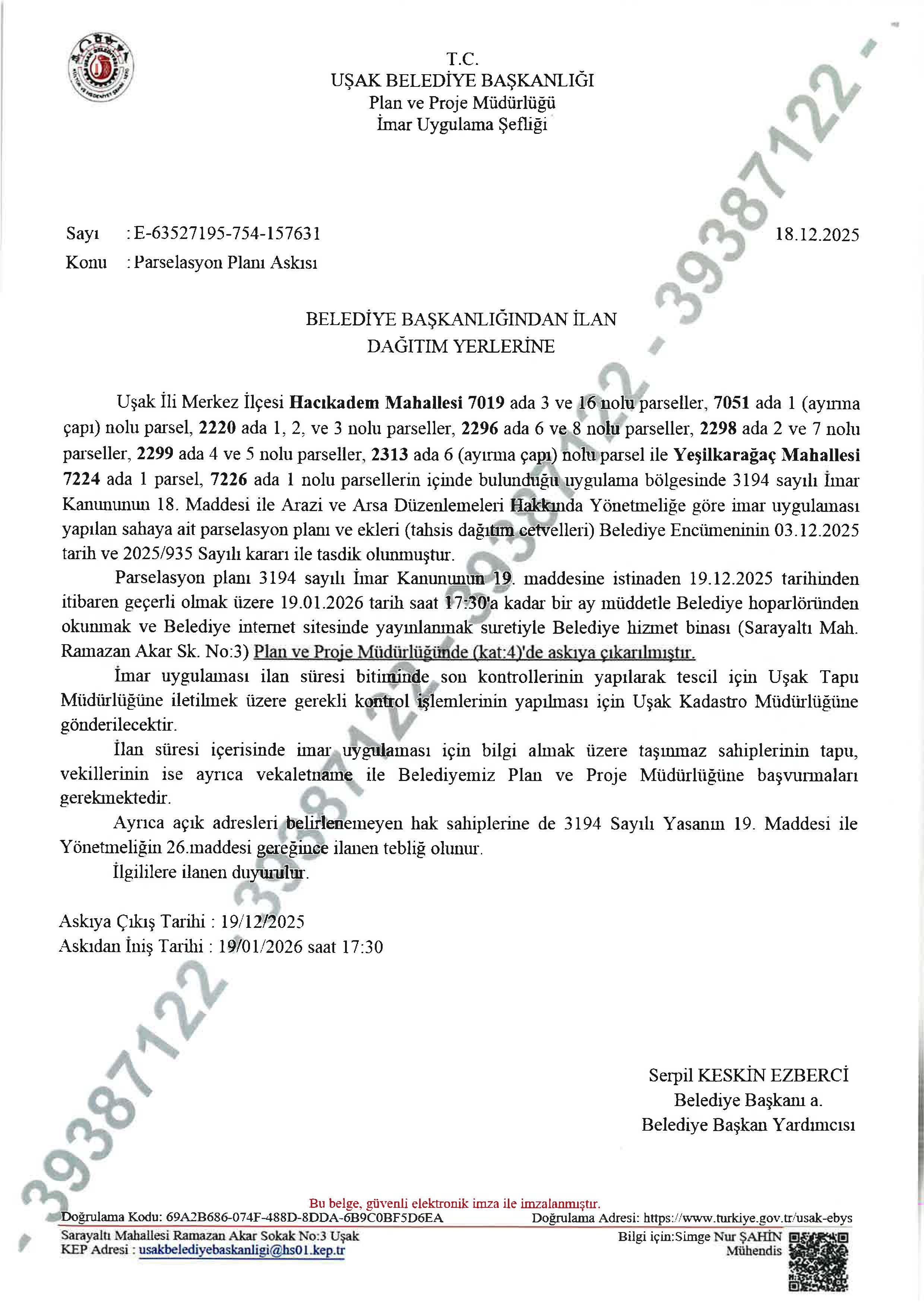 Parselasyon planı 3194 sayılı İmar Kanununun 19. maddesine istinaden 19.12.2025 tarihinden itibaren geçerli olmak üzere 19.01.2026 tarih saat 17:30'a kadar bir ay müddetle Belediye hoparlöründen okunmak ve Belediye internet sitesinde yayınlanmak suretiyle Belediye hizmet binası (Sarayaltı Mah. Ramazan Akar Sk. No:3) Plan ve Proje Müdürlüğünde (kat:4)'de askıya çıkarılmıştır.