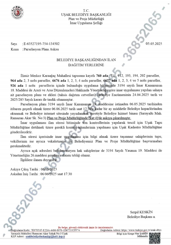 Karaağaç Mahallesi 760, 926, 964, 6676, 6677 Adalar muhtelif parsellerde 3194 Sayılı İmar Kanununun 18. Madde Uygulaması Yapılmaktadır. Uşak Belediyesi A Blok Kat 4 Plan ve Proje Müdürlüğü İmar Uygulama Şefliğinden bilgi alabilirsiniz.