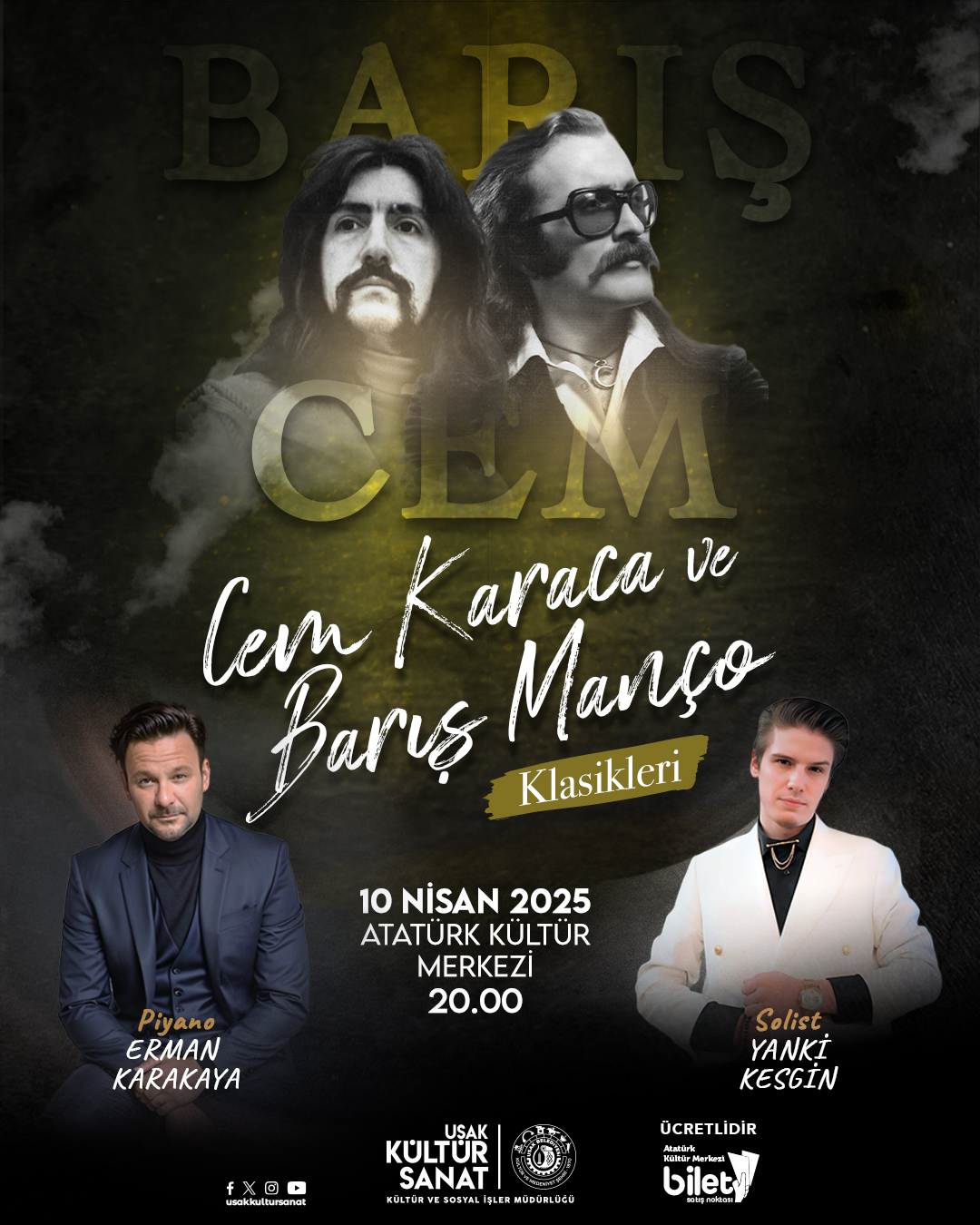 Cem Karaca ve Barış Manço Klasikleri ile Unutulmaz Bir Gece!Türk müziğinin iki efsane ismi Cem Karaca ve Barış Manço’nun klasikleşmiş şarkılarıyla dolu özel bir konser sizleri bekliyor! 10 Nisan 2025 Saat: 20.00 Atatürk Kültür ...