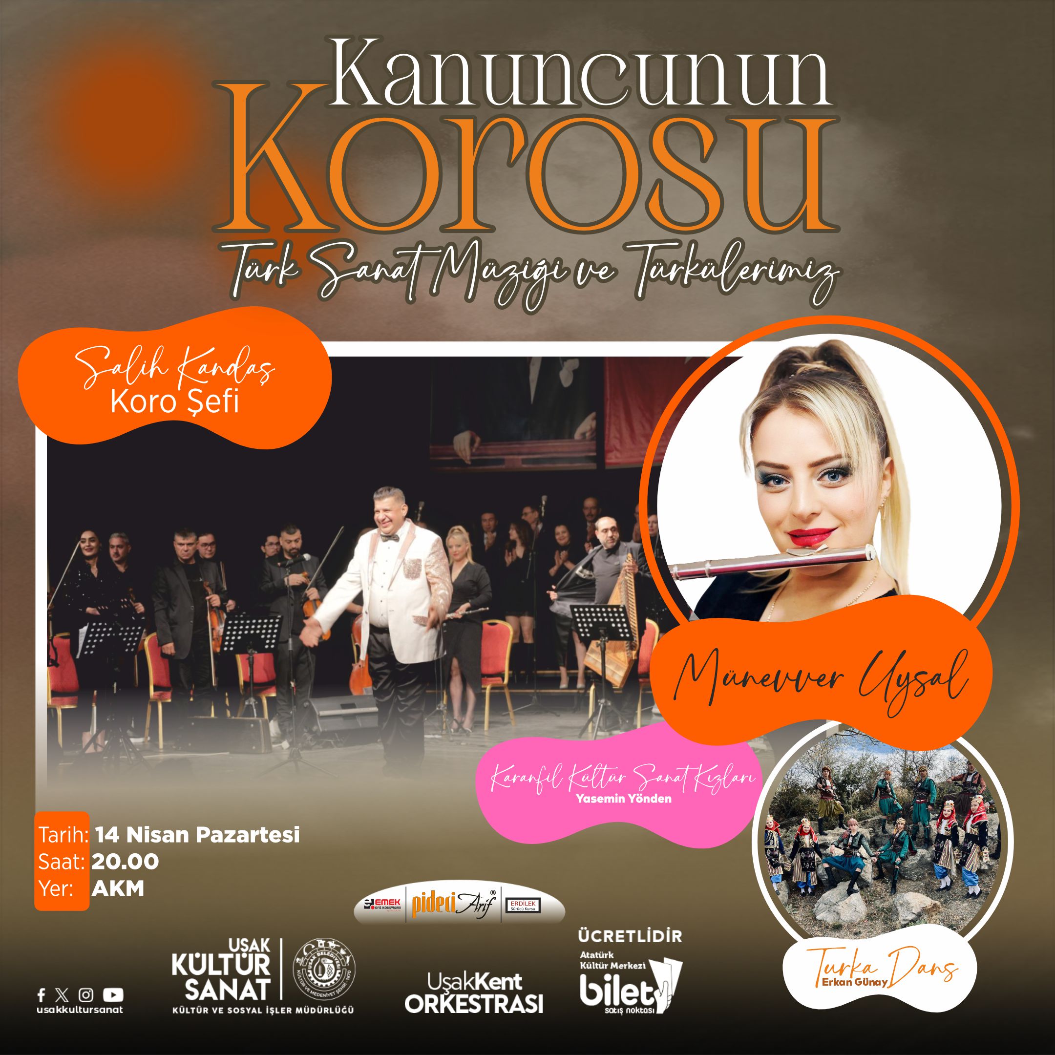 Bir Kanunun Peşinden Türk Sanat Müziğine Yolculuk... 14 Nisan akşamı, zarafetin sesi sahnede yükseliyor!Kanuncunun Korosu ile Türk Sanat Müziği’nin en özel eserleri ve yüreğe dokunan türküler, ustaların yorumuyla hayat buluyor. Uşak Kent ...