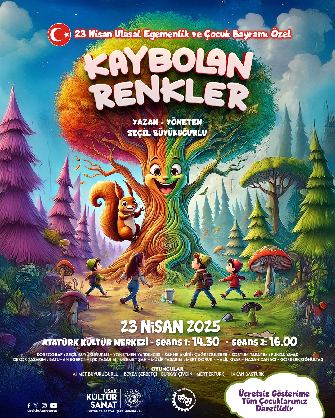 23 NİSAN COŞKUSU TİYATRO İLE TAÇLANIYOR! ????????✨Uşak'ta çocuklarımıza bayram hediyesi gibi bir tiyatro geliyor! ????KAYBOLAN RENKLERRenklerini kaybeden sihirli bir orman, neşesini arayan koca bir ağaç, yardımsever çocuklar ve bol kahkahalı, macera dolu bir hikâye ...