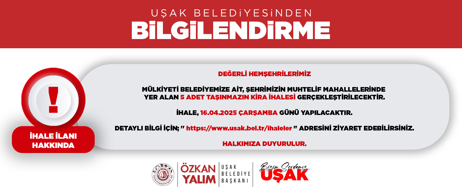 DETAYLI BİLGİ İÇİN; '' https://www.usak.bel.tr/ihaleler '' ADRESİNİ ZİYARET EDEBİLİRSİNİZ.