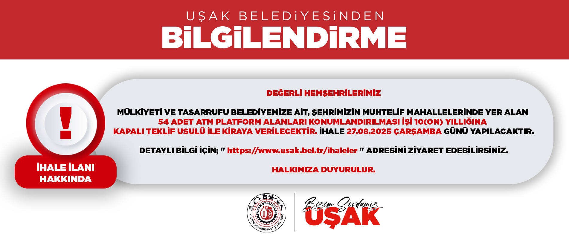 DETAYLI BİLGİ İÇİN; '' https://www.usak.bel.tr/ihaleler '' ADRESİNİ ZİYARET EDEBİLİRSİNİZ.