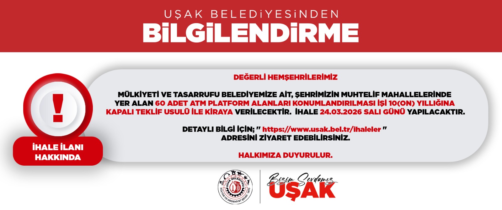 MÜLKİYETİ VE TASARRUFU BELEDİYEMİZE AİT, ŞEHRİMİZİN MUHTELİF MAHALLELERİNDE YER ALAN 60 ADET ATM PLATFORM ALANLARI KONUMLANDIRILMASI İŞİ 10(ON) YILLIĞINA KAPALI TEKLİF USULÜ İLE KİRAYA VERİLECEKTİR. İHALE 24.03.2026 SALI GÜNÜ YAPILACAKTIR.