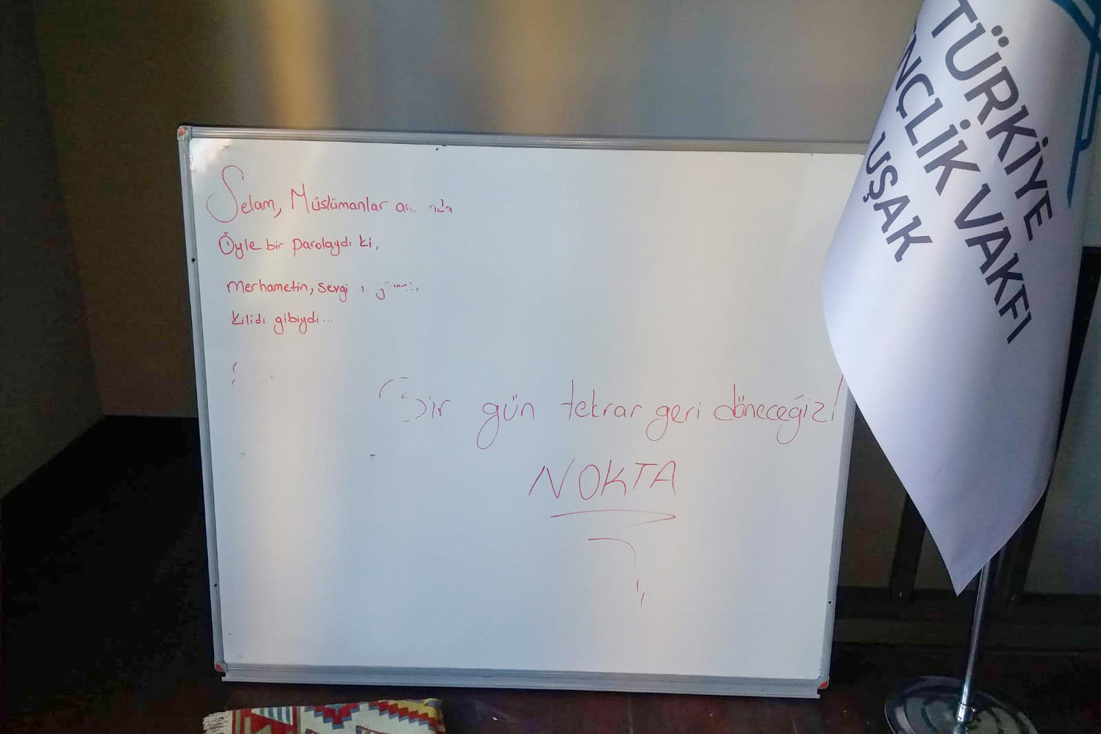 Daha sonra biz yetkilere açıklama yapınca olayın kamuoyuna yansımasıyla birlikte TÜGVA yetkilileri buraya gelip üstün körü temizleyip kırılan dökülen eşyaları düzeltmeye çalışmış. Hatta içeride bulunan bir panoya “Bir gün elbet geri döneceğiz” diye yazılmış.