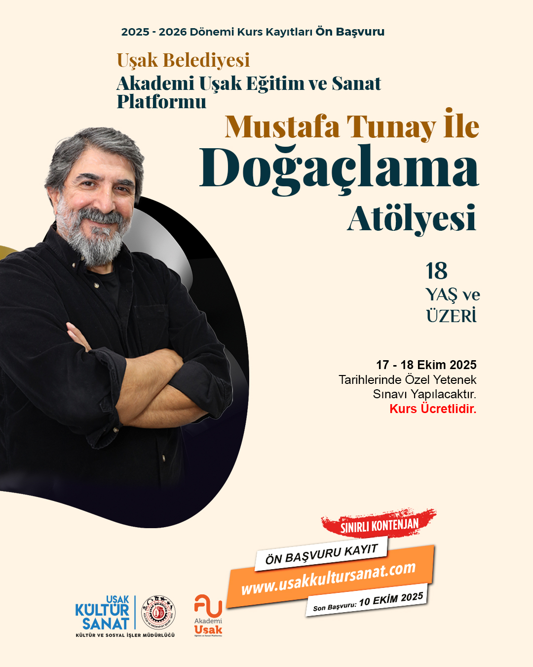 Öte yandan 18 yaş üzeri her vatandaşın katılabileceği ve alanında uzman hocalar eşliğinde gerçekleşecek olan doğaçlama atölyesi birçok insanın kültürel ve sanatsal hayatına katkıda bulunacak. Ön başvuru ve kayıt için 10 Ekim 2025 tarihine kadar www.usakkultursanat.com sitesine başvuru yapılabilecek. 17-18 Ekim tarihlerinde yapılacak olan Özel Yetenek Sınavı ile seçilecek olan öğrencilerle doğaçlama atölyesi çalışmalarına başlayacak.