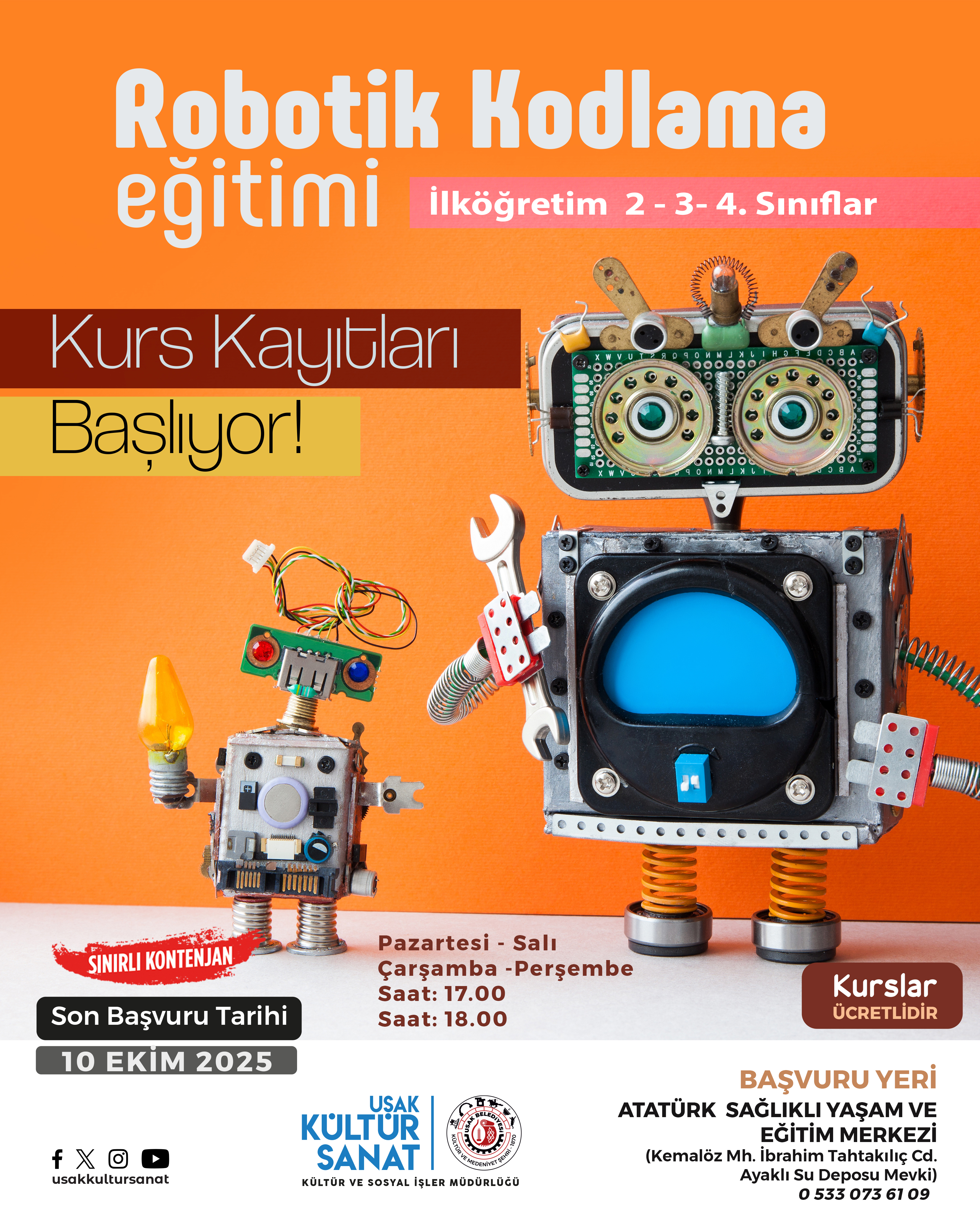 İlköğretim 2,3 ve 4. sınıf öğrencilerine yönelik düzenlenen robotik kodlama eğitimi ile çocuklar bilimin ışığında teknolojiyle tanışarak üretkenliklerini geliştirme fırsatı bulacak. Atatürk Sağlıklı Yaşam ve Eğitim Merkezi’nde Pazartesi- Salı – Çarşamba- Perşembe günleri düzenlenecek olan kursa kayıt için son başvuru tarihi 10 Ekim Cuma olarak belirlendi.