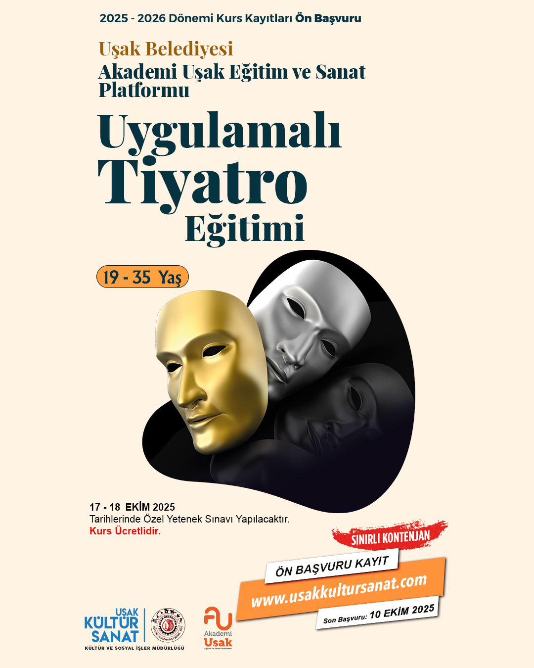 Uygulamalı Tiyatro Eğitimi Uşak Belediyesi Akademi Uşak Eğitim ve Sanat Platformunun uzman hocalarının vereceği eğitimlerle kapılarını aralıyor. 19-35 yaş arasındaki katılımcılar için düzenlenecek olan Uygulamalı Tiyatro Eğitimi özel yetenek sınavı ile öğrenci kabul edecek. Sınırlı kontenjana sahip kurs için www.usakkultursanat.com adresinden 10 Ekim 2025 tarihine kadar başvuruda bulunulabilecek. Deneyimli hocalar eşliğinde katılımcılar sahne deneyimi kazanma fırsatı yakalayabilecekler.