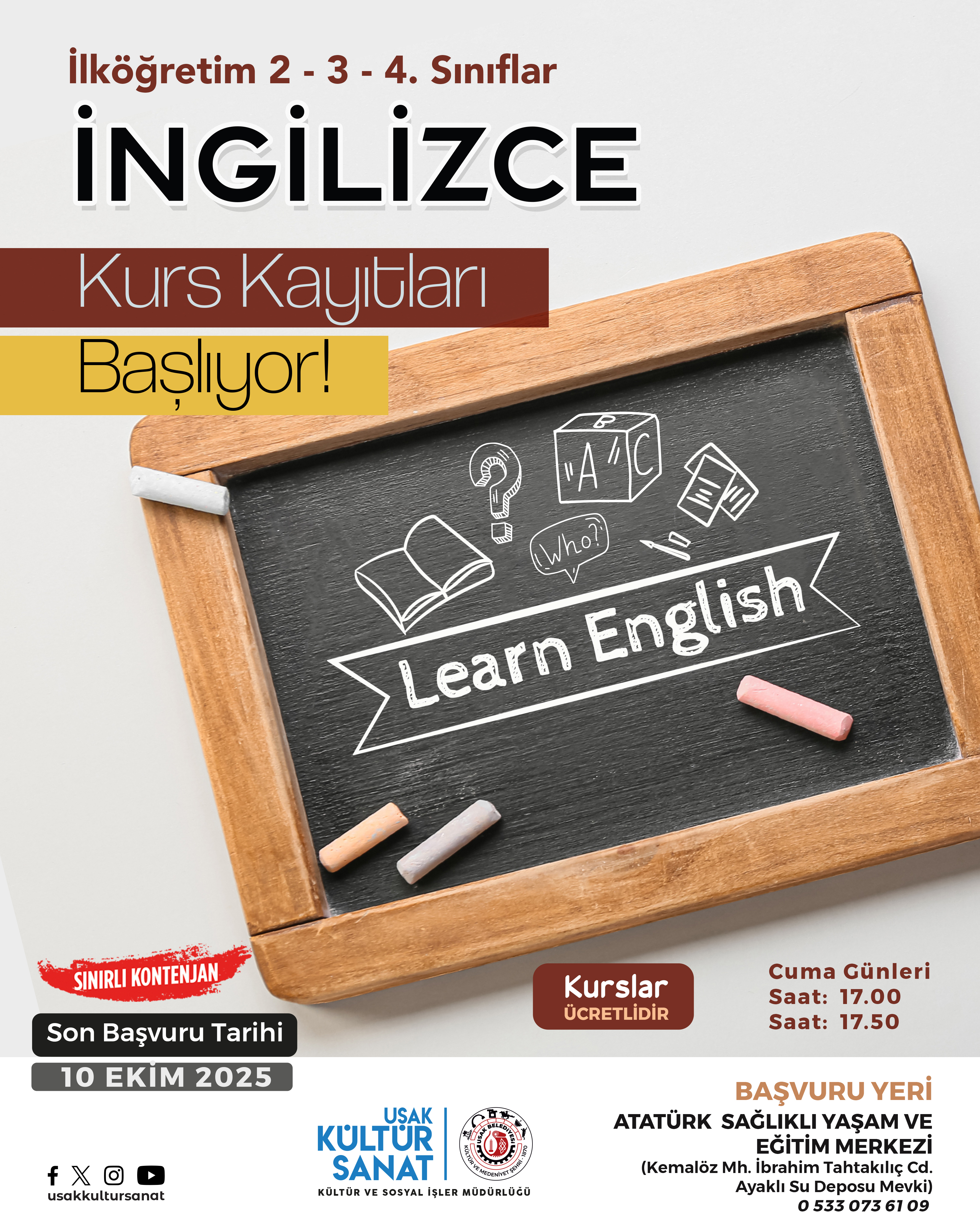 İlköğretim 2,3 ve 4. sınıf öğrencilerine yönelik düzenlenen İngilizce dil kursu için başvurular da yine 10 Ekim Cuma günü son bulacak. Atatürk Sağlıklı Yaşam ve Eğitim Merkezi’nde Cuma günleri yapılacak olan, çocukların eğlenerek öğrenebileceği kurs için başvurular bizzat yapılacak.