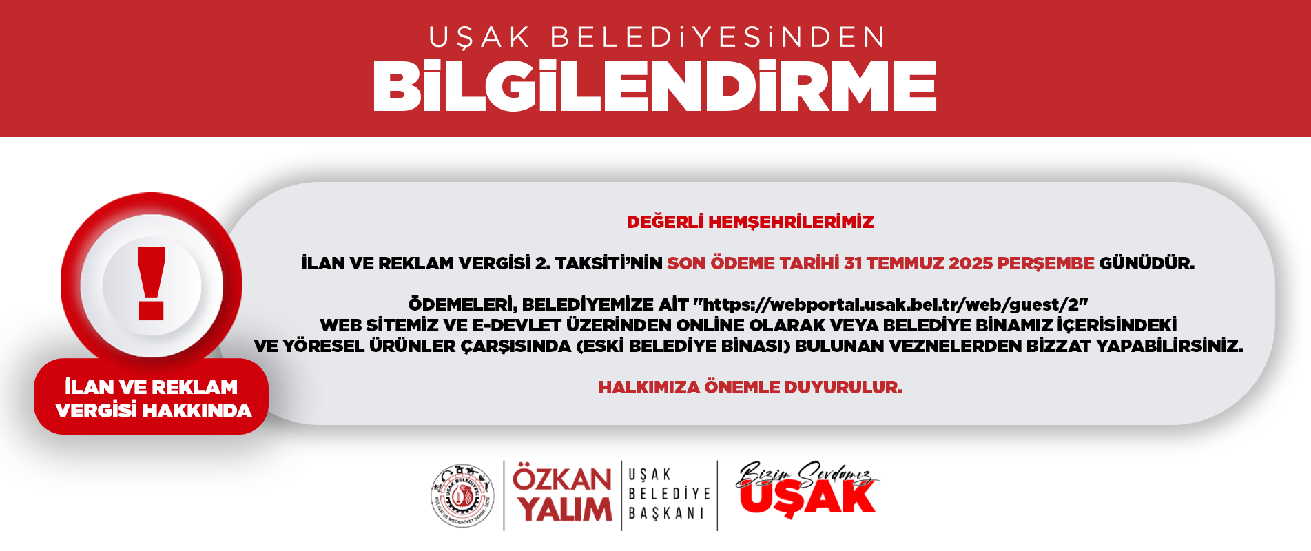 ÖDEMELERİ, BELEDİYEMİZE AİT "https://webportal.usak.bel.tr/web/guest/2" WEB SİTEMİZ VE E-DEVLET ÜZERİNDEN ONLİNE OLARAK VEYA BELEDİYE BİNAMIZ İÇERİSİNDEKİ VE YÖRESEL ÜRÜNLER ÇARŞISINDA (ESKİ BELEDİYE BİNASI) BULUNAN VEZNELERDEN BİZZAT YAPABİLİRSİNİZ. ÖDEME YAPTIYSANIZ LÜTFEN BU MESAJI DİKKATE ALMAYINIZ.