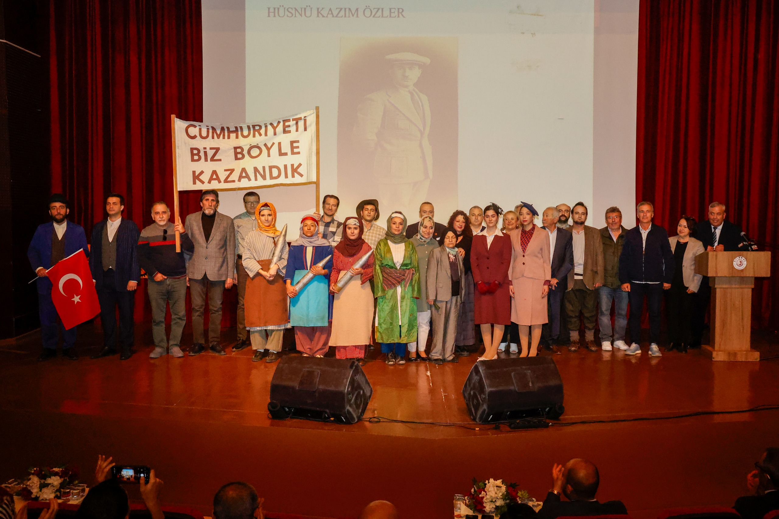 “Bu eser sadece bir tarih kitabı değil; yokluklar içinden doğan bir milletin kararlılığının, inancının ve onur mücadelesinin yansımasıdır. Cumhuriyet, yeniden ayağa kalkmanın, yeniden var olmanın simgesidir. Cumhuriyet, yalnızca cephelerde savaşan askerlerin değil; cephe gerisinde mücadele eden kadınların, köylülerin ve gençlerin ortak eseridir” dedi.